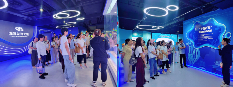 上午,一行人走进珠海海洋科普中心,开启“探秘深蓝”的第一站。这座传播海洋知识、弘扬海洋文化的前沿阵地,围绕“海洋观测技术迈进智能时代”“发现海洋中的未知奥秘”“珠海,向海而兴” 三大核心主题精心打造的丰富展示与体验项目,恰是广东省海洋经济工作会议所强调的“坚持创新驱动、基础先行”的生动实践,瞬间将众人引入神秘的深海世界。在“海洋生态”展区,教师们驻足观赏精致的海洋生物标本模型,透过科普短片解码海洋生态的平衡密码;沉浸式鲸落光影秀中,“一鲸落,万物生”的深海奇观扑面而来,让大家在光影流转间触摸深蓝世界的生命韵律,深切感悟海洋强国建设中守护生态平衡的重要使命。