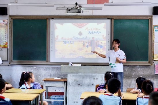 实践团成员运用AI技术还原历史画面、编制绘本,生动展现了林基路先生从台山都斛走出、远赴新疆投身革命的历程。在讲解过程中,实践团成员用生动有趣的话语和互动的方式,给二年级的小朋友们讲述了当时的历史背景与林基路的英勇无畏。他们通过绘本中的图画,带领孩子们“走进”林基路先生曾经生活和工作的地方,让大家了解他是怎样励精图治追求革命、为新疆的孩子们上学读书、带领新疆人民修建水坝与桥梁。林基路同志在困难的环境下依然坚持自己的信念,最后为国为民献出生命的感人故事,也让小朋友们听得入迷、深受感动。