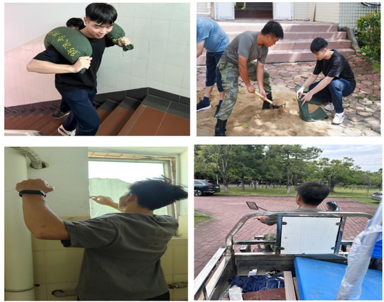 退役军人学生党员在防御台风一线开展物资运输、沙袋搬运和宿舍稳固等工作