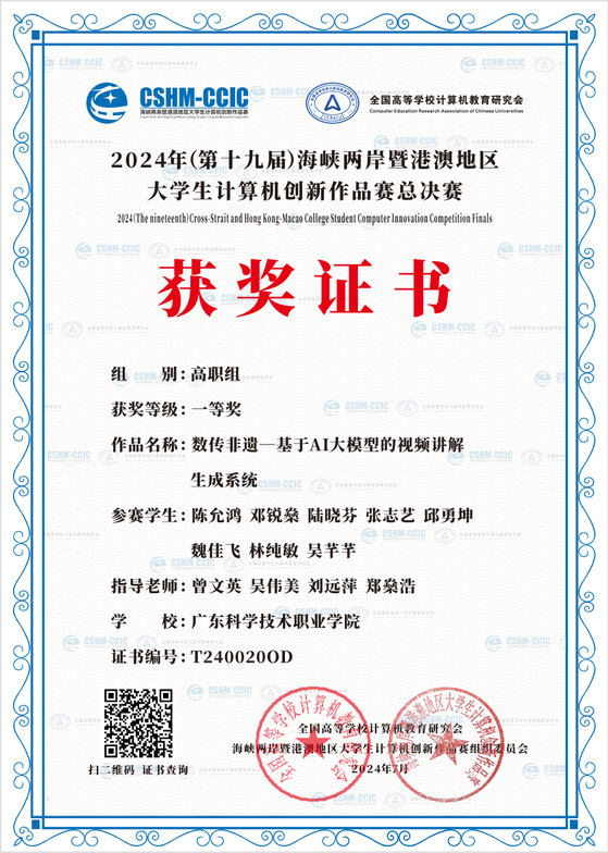 陈允鸿团队获得2024年(第十九届)海峡两岸暨港澳地区大学生计算机创新作品赛总决赛一等奖