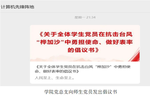 风声雨声就是动员令,党旗党徽彰显担当。计算机学院党总支号召党员主动担当成功凝聚了师生党员的强大合力,经受住了台风的考验。这充分证明了党建引领是战胜一切艰难险阻的根本保证,也展现了新时代高校基层党组织强大的动员能力和师生党员昂扬的精神风貌。