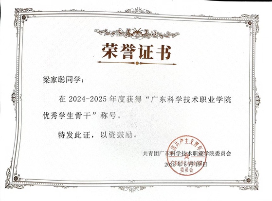 梁家聪在2024-2025年度获得“广东科学技术职业学院优秀骨干称号”