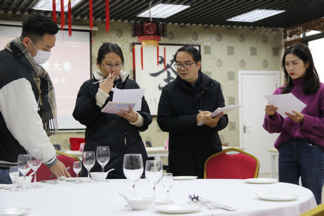 本站讯(通讯员:李嘉伟 摄影:陈涛)为了选拔参加2020-2021年度全省职业院校学生专业技能大赛餐厅服务比赛的苗子,提升旅游学院学生的专业素质和综合素养,达到以赛促训、以赛促学、以赛促教的目的。1月11日,旅游学院酒店管理专业在S5-302举行了校内选拔赛。段金梅、李嘉伟、吴迪、王红艳、郭卫娜、李任欣老师担任比赛评委。旅游学院部分师生一同观摩了此次比赛。
