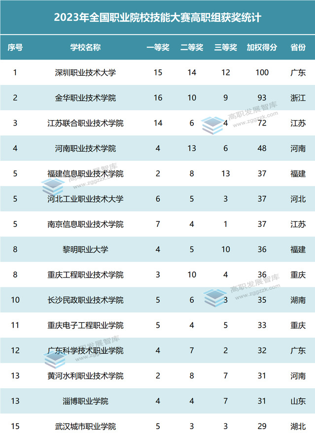 据高职发展智库统计,本次高职组共847所高职院校获奖,考虑到不同级别奖项的获奖难易程度和价值,高职发展智库对其赋予不同的权重,具体赋权情况为:一等奖4倍权重,二等奖2倍权重,三等奖按照实际获奖数量计算。根据高职发展智库设计的权重计算,我校以加权得分32分位居全国第十二位。