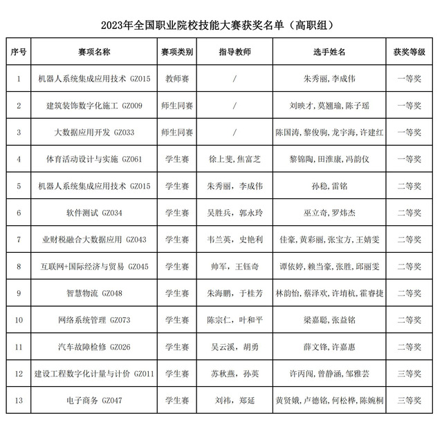 本站讯 4月16日,全国职业院校技能大赛执行委员会正式公示了2023年全国职业院校技能大赛国赛获奖名单。我校代表广东省参赛共获得13个奖项,其中一等奖4项、二等奖7项、三等奖2项,成绩再创历史新高。本次大赛首设师生同赛赛道和教师赛道,我校师生参加两项师生同赛项目和一项教师参赛项目,均获得国赛一等奖的好成绩。