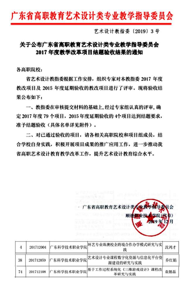 本站讯(通讯员:袁懿磊)近日,由广东省高职教育艺术设计专业教学指导委员会组织的广东省高职教育艺术设计类专业教学改革项目研究课题结题评审顺利结束,经专业评审,教指委领导小组审核,全省共有79项通过验收。此次我院送审的3项研究课题结项材料全部顺利通过,并颁发了结题证书。3项研究课题分别为:沈鸿才副院长主持的重点项目《环艺专业珠澳校企跨境合作办学模式研究与实践》;乔红娟副教授主持的一般项目《艺术设计专业课程数字化资源与信息化平台资源建设的研究与实践》;袁懿磊老师主持的青年教师项目《基于工作过程系统化〈三维游戏设计〉课程改革研究与实践》。