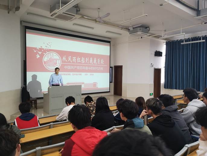 本站讯  为积极响应广东省2021年春季学期高校党组织书记、院长上第一堂思政课的文件要求,结合习近平总书记在党史学习教育动员大会上的重要讲话精神。49日上午,艺术设计学院院长、党总支副书记沈鸿才在教学楼4-108以“从风雨红船到巍巍巨轮”为主题,为2020级产品设计1234班和环境艺术设计1班共260多名学生讲授春季学期“思政第一课”。