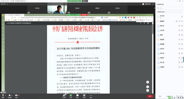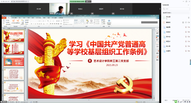 本站讯  2021924日,艺术设计学院教工第二党支部通过WeLinkm网络视频会议集中学习《中国共产党普通高等学校基层组织工作条例》、《中华人民共和国教育法(2021修订)》以及举行2021年纪律教育学习月活动动员部署,全体党员参加此次系统学习,会议由党支部书记曹春晓主持。