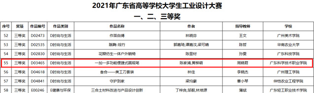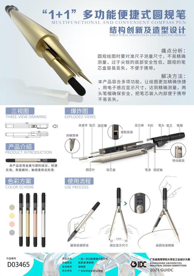 本站讯 近日,艺术设计学院产品艺术设计专业在“2021年广东省高等学校大学生工业设计大赛”中取得佳绩。由周晓君老师指导的学生团队:陈家浦、黄柳萌同学的参赛作品“一加一多功能便携式圆规笔”从近5000件参赛作品中脱颖而出,荣获三等奖。