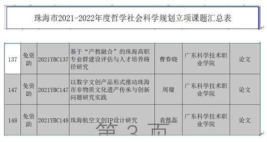 本站讯 近日,根据珠海市哲学社会科学规划领导小组办公室发布的《珠海市2021-2022年度哲学社会科学规划立项课题汇总表》,经学校推荐,珠海市哲学社会科学规划办组织专家评审,艺术设计学院共3项项目获批立项,分别为:曹春晓副院长的《基于“产教融合”的珠海高职专业群建设评估与人才培养路径研究》项目,周璇老师的《以数字文创产品形式推动珠海市非物质文化遗产传承与创新问题研究实践》项目,袁懿磊老师的《珠海航空文创IP设计研究》项目。