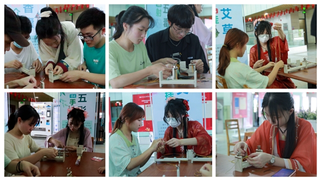 此次活动主要内容是缝制艾草香囊和编五彩缕手绳。活动现场,艺术设计学院青竹汉服社指导老师郑光明带领着身穿汉服的社员们,向参与活动的同学们介绍了端午织香囊和系五彩绳的历史,以及相关物品的制作材料、制作过程、制作工艺及造型特色,并全程指导前来参加活动的同学完成艾草香囊和五彩缕手绳的制作。参与同学热情高涨,或手拿针线或选取五彩绳,认真缝制香囊、编织五彩绳,体验传统手工民俗的风情并探索感知背后的意义。