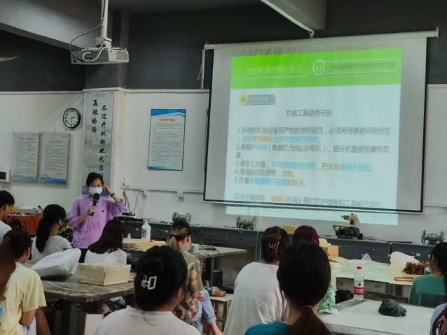 培训主讲刘秋云老师首先为学生介绍了机械设备、工具的安全操作规程,同时结合自身丰富的实操经验,为学生讲解和演示了设备的工作原理、规范操作步骤和注意事项,最后现场指导学生进行设备的实际演练。