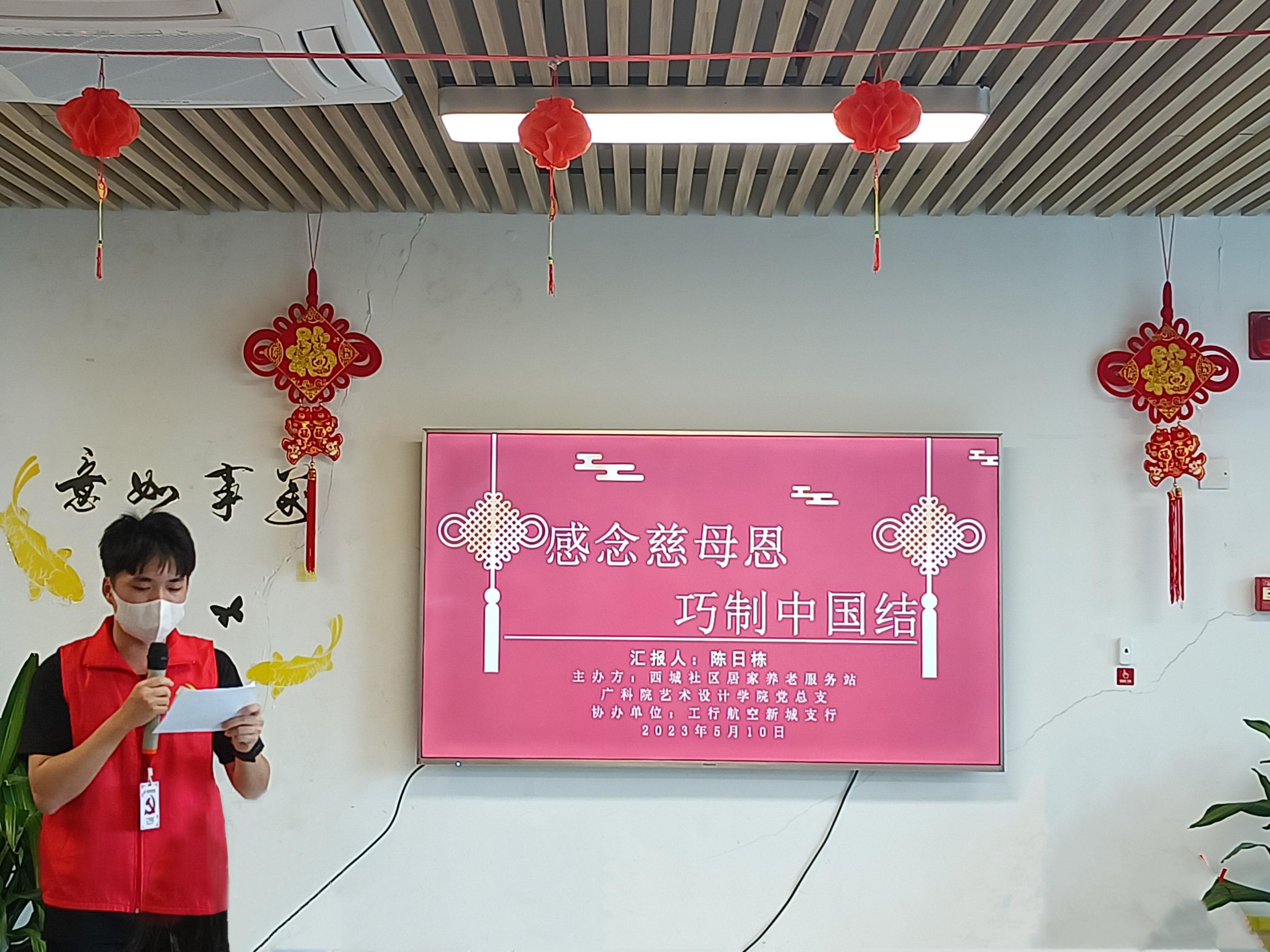 本站讯 为了进一步弘扬孝亲敬老的传统美德,表达对父母的敬意和感恩之情,让长者们感受手工制作的魅力。2023510日下午,艺术设计学院走进西城社区,开展“感念慈母恩,巧制中国结”的手工课活动。