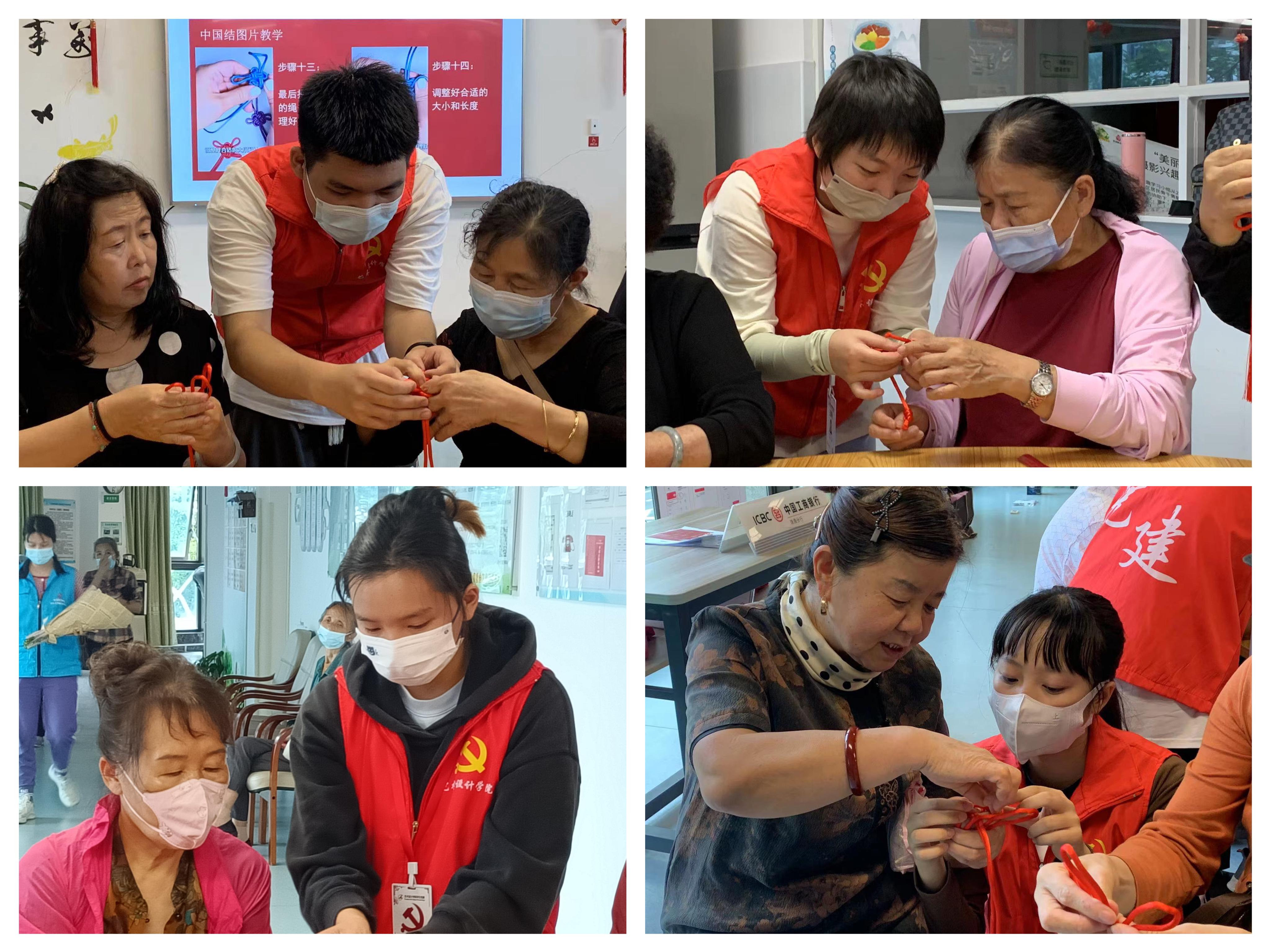 活动开始前,很多长者早早的来到了社区,期待与志愿者一起制作美丽的中国结。在制作中国结的过程中,志愿者与长者们积极配合,各显神通,依据教程进行再度创新在志愿者的协助下长者们制作出了各具特色的中国结看着这些美丽的中国结,长者们的喜悦之情洋溢在脸上。
