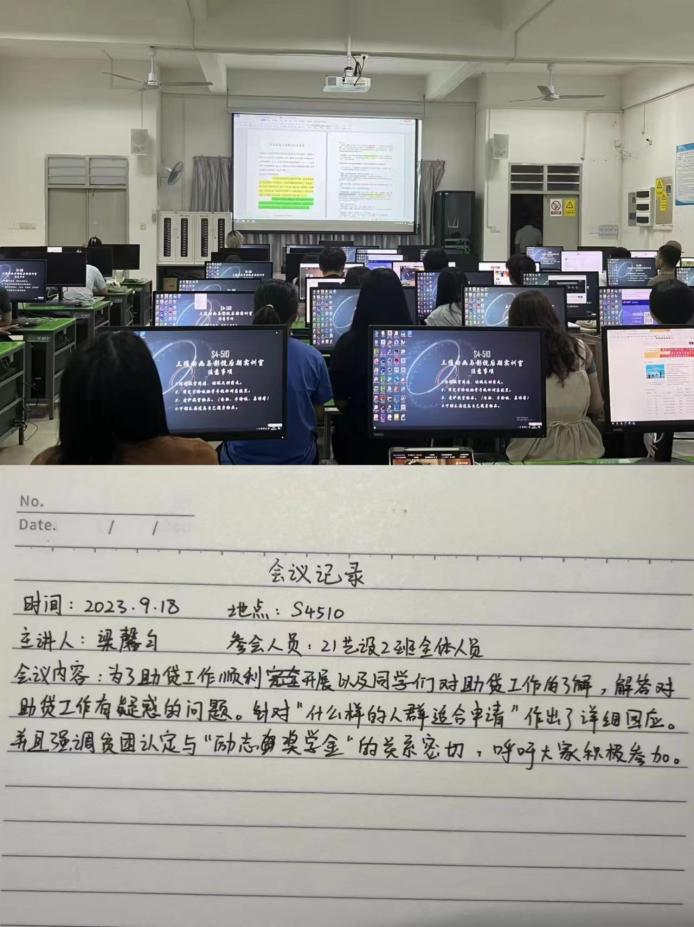 各班负责人回到班级组织会议,为同学们介绍了国家、地方政府和学校资助政策的资助金额,资助对象,主要申请条件及国家资助政策的重大意义同学们对此十分重视,每个班级的学生都能认真讲并做好笔记。