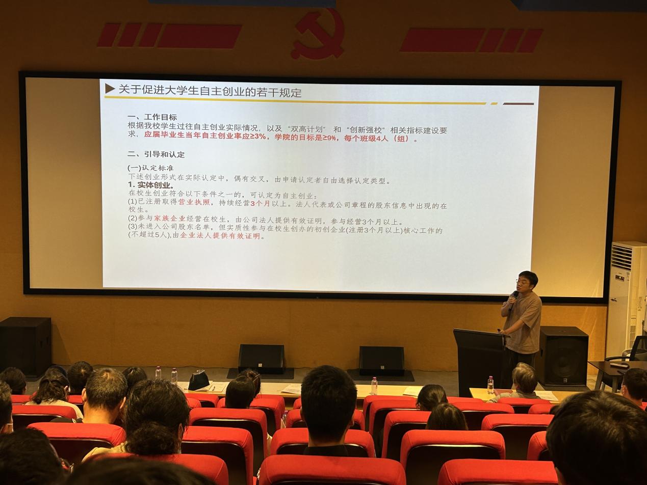 随后,艺术设计学院创新创业工作办公室主任宫本京老师详细解读了学校促进大学生自主创业的相关制度文件,辅导员梁昊简要介绍了大学生自主创业的认定流程及资料提交要求,让班主任对促进大学生自主创业工作有了更加清晰的认识和了解。