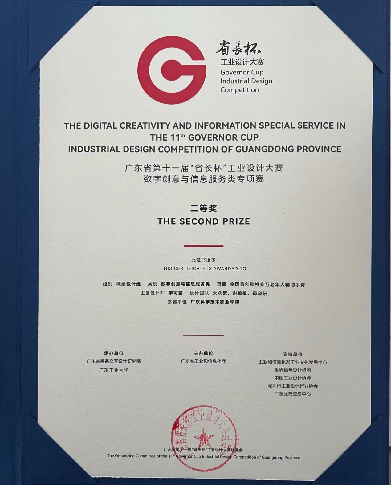 据悉,广东“省长杯”工业设计大赛自创办以来,已成功举办十一届,成为全国最具权威性与影响力的工业设计竞赛之一。大赛旨在推动广东工业设计水平的提升,并助力制造业的转型与升级。广东省第十一届省长杯工业设计大赛数字创意与信息服务类专项赛,征集超过 1000 件参赛作品,经过省直赛区和地市分赛区初赛评审,复赛经过行业专家评审们的综合评审,最终共评选出 30 件专项赛获奖作品。颁奖典礼上,大赛共揭晓了包括概念设计组和产品设计组在内的获奖名单,一等奖2名,二等奖10名,三等奖18名。本届赛事中,艺术设计学院工业设计专业的朱永豪老师指导学生团队李可莹创作的作品《全国首创脑机交互老年人辅助手臂》在逾千件参赛佳作中脱颖而出,荣获二等奖。
