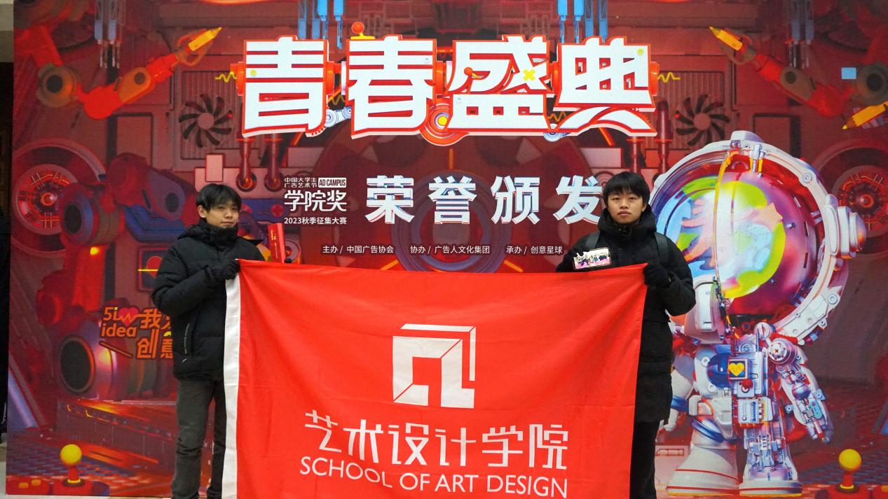 本站讯 20231223中国大学生广告艺术节学院奖大赛在北京电视台举行颁奖典礼。广东科学技术职业学院艺术设计学院和韩山师范学院联培视觉传达专业生在此次活动中喜获金奖,获奖师生赴颁奖典礼现场领奖。