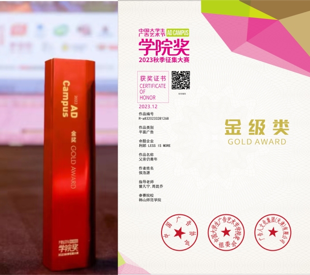 中国大学生广告艺术节学院奖始创于1999年,历经23年沿革,活动覆盖全国23个省、4个直辖市、5个自治区、2个特别行政区,是全国性的大学生广告专业奖项。中国大学生广告艺术节学院奖是经中央批准,国务院评比达标表彰工作小组同意设立的中国广告业大奖(下设长城奖、黄河奖、中国大学生艺术节学院奖)是由国家工商总局批准、中国广告协会主办的全国大学生广告艺术大型活动。学院奖在全国各高等院校中深入人心,其影响已从高校延伸至广告行业,成为行业遴选人才,企业获取新鲜创意,品牌探索年轻化的重要途径。经过现场角逐,由艺术设计学院曾凡宁老师和周昆乔老师指导联培学生侯浩源创作的作品《父亲仍青年》最终从利朗命题7350份作品中脱颖而出,荣获平面广告类唯一金奖。