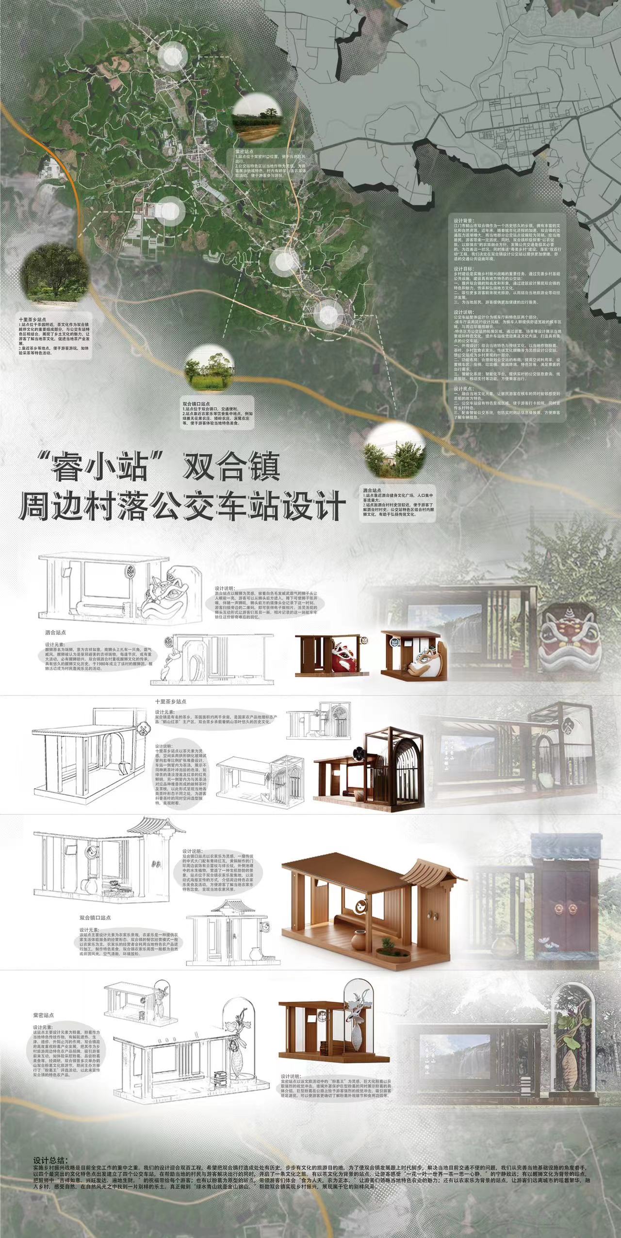 比赛自2023年9月启动,艺术设计学院积极动员师生,组织团队前往珠海市斗门区、香洲区和肇庆市四会市等地,通过实地察看、查阅资料、交流访谈等形式,了解当地的人居环境、建筑设施、村容风貌等实际情况,以创新设计理念,突出岭南特色,深入挖掘乡村优秀文化资源。其中,由邹佳慧和袁晓鹏指导学生团队钟乔曜、陈明洋、文东升和张希程创作的作品《“睿小站”双合镇周边村落公交站点设计》作品获得高校组三等奖。