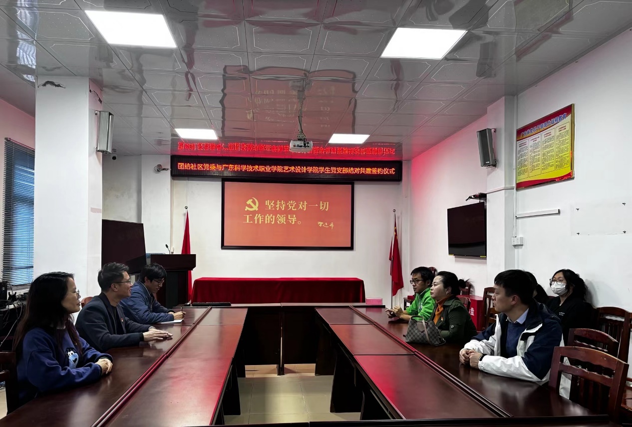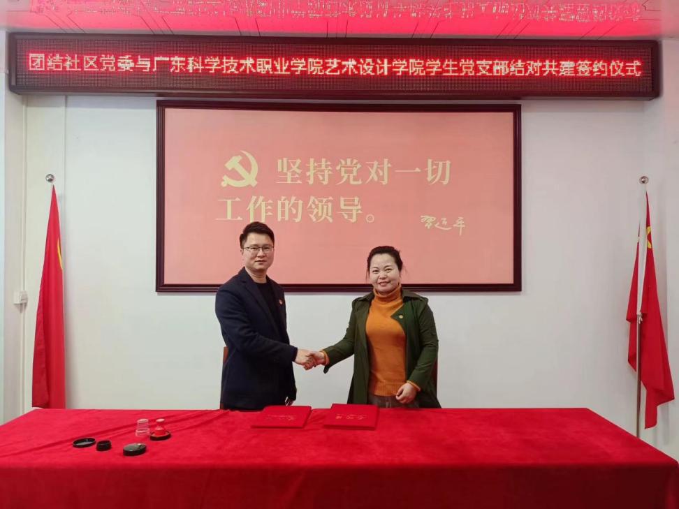 本站讯 为进一步探索高校党组织与地方基层党组织党建新模式,增强党建优势互补,3月13日下午,艺术设计学院党总支与斗门区白藤街道团结社区党委举行党组织共建签约仪式。团结社区党委书记杨文超,艺术设计学院党总支组织委员、学生党支部书记刘炎君,团委书记梁昊等参加签约仪式。