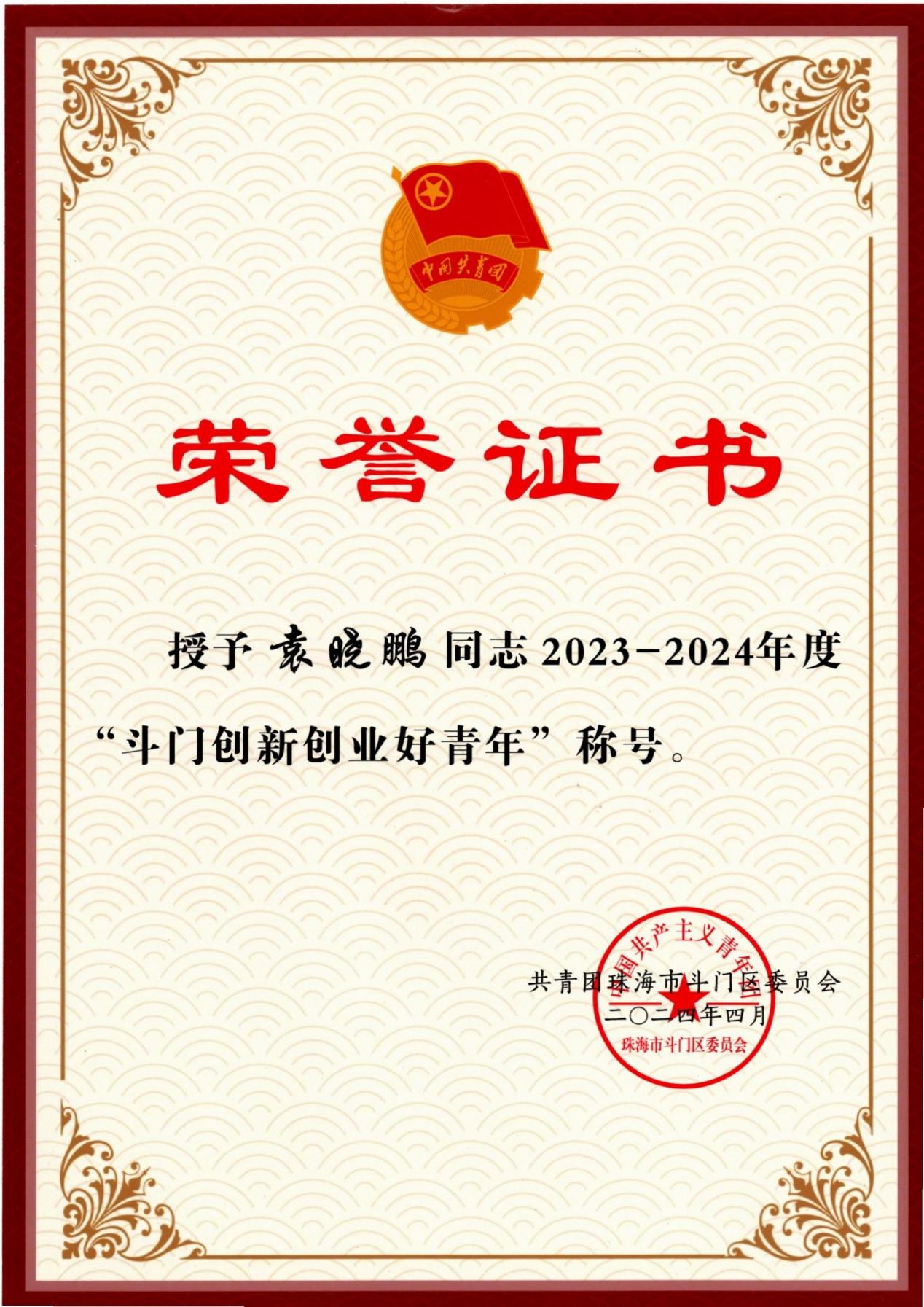 近日,由共青团珠海市斗门区委员会组织开展的2024寻找“斗门好青年”主题活动名单揭晓,经过激烈角逐,艺术设计学院工业设计专业教师袁晓鹏获评“斗门区创新创业好青年”荣誉称号。