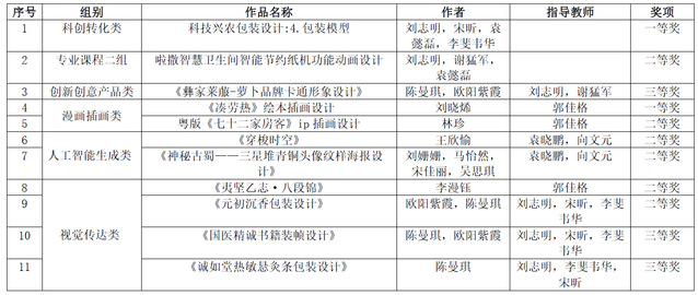 据悉,中国好创意暨全国数字艺术设计大赛,简称3C大赛,是入选教育部中国高等教育学会发布的《全国普通高校学科竞赛分析报告》赛项,也是我国第一个以数字艺术设计、数字创意及数字媒体、数字技术创新领域各专业综合类规模大、参与院校多、影响广泛的权威赛事。大赛旨在落实国家数字创意产业远景规划,转化高等院校原创知识产权,深度挖掘、选拔和推广中国创意界的精英人才和优秀作品;赛事一直在引领着学科发展、推动专业建设,已经成为高校艺术创意领域的风向标。经过省赛和国赛的激烈角逐,艺术设计学院学子作品3172所高校(以二级学院为单位)的263891件参赛作品中脱颖而出,斩获全国等级奖11其中,国赛教师单元(高职赛道)2项,刘志明、宋昕、袁懿磊、李斐韦华的作品《科技兴农包装设计:4.包装模型》荣获一等奖;刘志明、谢猛军、袁懿磊的作品《啦撒智慧卫生间智能节约纸机功能动画设计》荣获等奖。国赛(高职赛道)9项,佳格指导学生刘晓烯创作的作品《凑劳热绘本插画设计荣获一等奖;由郭佳格指导学生林珍创作的作品粤版《七十二家房客》ip插画设计袁晓鹏向文元指导学生刘姗姗马怡然宋佳丽吴思琪创作的作品《神秘古蜀——三星堆青铜头像纹样海报设计》,袁晓鹏向文元指导学生王欣愉创作的作品《穿梭时空》,郭佳格指导学生李漫钰创作的作品《夷坚乙志·八段锦》,刘志明宋昕李斐韦华指导学生欧阳紫霞陈曼琪创作的作品《元初沉香包装设计荣获二等奖;刘志明谢猛军指导学生陈曼琪欧阳紫霞创作的作品《彝家莱菔-萝卜品牌卡通形象设计》,刘志明宋昕李斐韦华指导学生欧阳紫霞陈曼琪创作的作品《国医精诚书籍装帧设计》,刘志明李斐韦华宋昕指导学生陈曼琪创作的作品《诚如堂热敏悬灸条包装设计》荣获等奖。