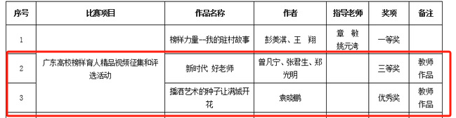 广东高校榜样育人精品视频征集和评选活动涵盖了德育、智育、体育、美育、劳育等多个方面,体现了教育工作者在榜样育人方面的创新与实践。获奖作品不仅展现了高质量的制作水准,更在内容上深刻诠释了榜样的力量和育人的价值。本次创作大赛共评选出一等奖20项、二等奖30项、三等奖40项、优秀奖56项。其中艺术设计学院曾凡宁、张君生和郑光明创作的作品《新时代 好老师》获省级三等奖,袁晓鹏创作的作品《播洒艺术的种子让满城开花》获省级优秀奖。