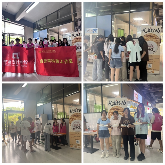 我院“真善美科普工作室”在学校第五食堂一楼设置了线下“光盘行动”打卡点,同学们就餐后到打卡点,进行打卡并领取奖品。聚点滴之俭,添光盘之彩,每一张光盘图片都流露出大家对于节约粮食的支持。同时,志愿者开展线下宣传活动,通过发放宣传资料、张贴海报等方式,向同学们普及世界粮食日和国家粮食宣传周的意义与目的,介绍国家粮食的重要性和不可或缺性,激励学生深刻理解粮食的珍贵与来之不易,倡导节约粮食,反对浪费的良好习惯,推动爱粮节粮、成为校园新风尚。线下宣传活动得到了同学们的热烈反馈,大家纷纷表示,要在今后的生活中,从自身做起,从点滴做起,做维护粮食安全的践行者、弘扬节俭美德的倡导者,践行光盘行动,引领节俭新食尚。