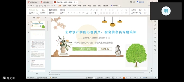 本站讯 为了确保24级心理委员和宿舍信息员能更好地为同学们提供心理健康支持,艺术设计学院于12月18日下午2:30,以“大学生心理危机识别与干预”为题举行了线上专题培训会。培训会由艺术设计学院心理辅导员郑光明主讲,24级心理委员、宿舍信息员代表参加。