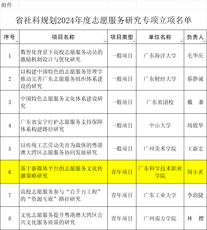 据悉,2024年度广东社科规划志愿服务研究专项立项8项,我院项目是广东省高职院校唯一入选的项目。