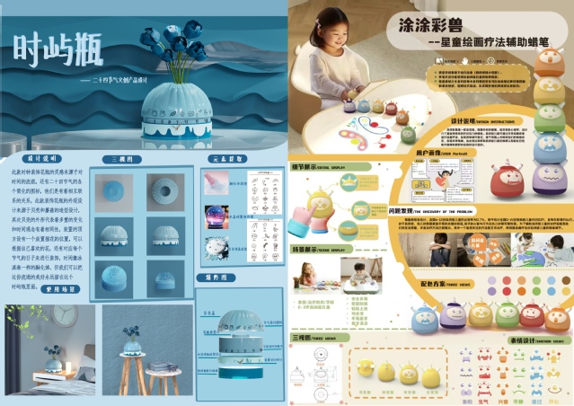米兰设计周-中国高校设计学科师生优秀作品展是由中国教育国际交流协会、中国高等教育学会于20162019年期间联合发起并主办的中国高校设计创新实践大赛暨米兰作品展系列活动,赛事旨在真实反映新时代背景下我国设计学科教学水平的现状和教学成果,为全国艺术学科师生搭建展示专业才华和创作水平的国际化交流学习平台。本次比赛吸引了来自全国各地的优秀学子参与,竞争异常激烈。艺术设计学院选送的作品经过激烈的省赛,突出重围,进入国赛。其中,由袁晓鹏指导学生甘舒琪创作的作品《涂涂彩兽——星童绘画疗法辅助蜡笔》获得三等奖;由袁晓鹏指导学生团队晏柔柔、陈锦悦和江越创作的作品《时屿瓶》获得三等奖。作品《涂涂彩兽——星童绘画疗法辅助蜡笔》聚焦自闭症儿童情感所需,运用艺术绘画疗法帮助自闭症儿童在情感认知和社交技能方面得到更好的发展,作品《时屿瓶》巧妙融合传统文化与现代设计,将二十四节气重新演绎。这些作品充分展现了艺术设计学院师生扎实的专业功底、敏锐的创新思维和强烈的社会责任感。