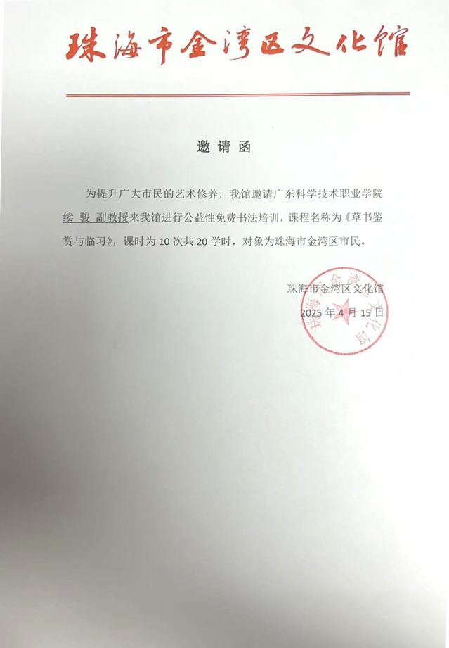 本站讯 为提升广大市民的艺术修养,推动非学历艺术教育惠及更多市民,艺术设计学院教师续骏受邀于金湾区文化馆开展为期10次的《草书鉴赏与临习》公益艺术课程。作为金湾区文化馆本年度重点打造的系列公益培训项目之一,该课程自开设以来便受到广大市民的热烈欢迎,报名人数远超预期。目前课程正在有序开展中,预计将累计培训300人次,有效满足市民对高品质文化生活的需求。