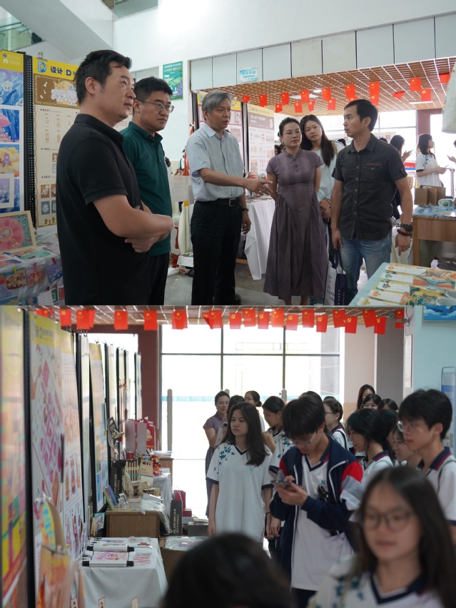 到访当日,两校师生先后前往学校图书馆参观艺术设计学院2025届毕业设计展。展厅内,平面设计作品色彩斑斓、创意独特,学生们以大胆的色彩碰撞、独特的图形组合,勾勒出一个个充满想象力的视觉世界。有的作品用鲜明色彩传递环保理念,如炽热红与清新绿的交织,象征着人类与自然的和谐共生;有的则以抽象线条勾勒时代脉搏,似灵动音符在画布上跳跃,引发观者对现代生活的深刻思考。来访师生不停驻足欣赏,纷纷为设计者的专业素养与创新思维点赞。