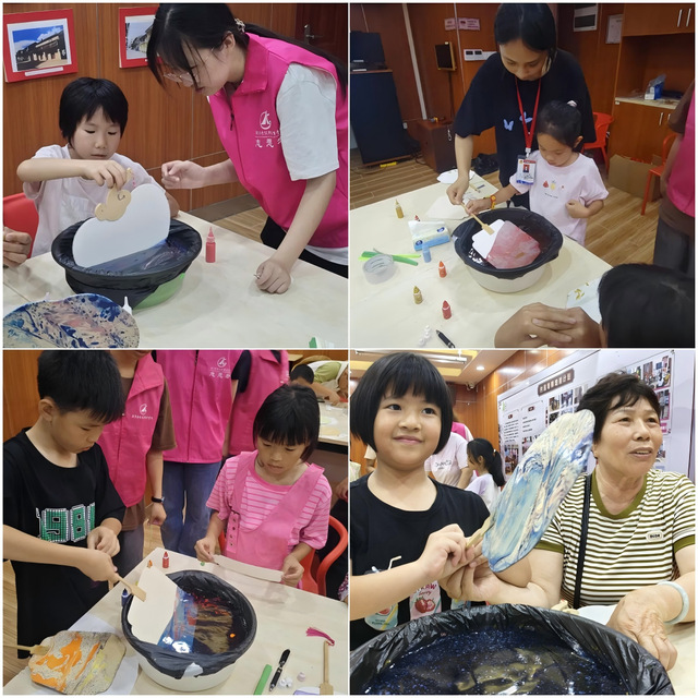 实操环节中,师生们化身“非遗导师”,分步骤指导居民制作漆扇。以天然大漆为原料,调配出红、金、青等传统色系,老人手持竹筷轻拨漆液,在水中瞬间绽放出绚丽的抽象图案。孩子们将素白扇面缓缓浸入水中,通过旋转、倾斜等手法,让漆色自然吸附于扇面。一位参与培训的老人感慨:“原来这扇子背后有这么多故事,现在的年轻人懂得真多!以前觉得漆艺高深莫测,今天才发现只要敢动手,也能做出艺术品!”