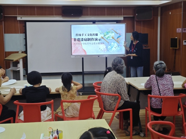 在培训成果展示环节,孩子们举着绘有卡通图案的漆扇欢呼,老人们则展示着作品,现场洋溢着成就感与喜悦。