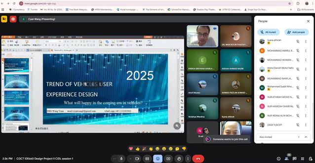 讲座持续2小时。王远老师全程用英文完成了此次讲座,并与听众开展热烈互动。王远老师从人机共驾、外部环境交互、多通道显示、无缝多设备链接等多个方面深入浅出阐述了未来智能汽车用户体验设计发展趋势,并以生动案例展现了中国新能源汽车在用户体验设计方面的领先应用。“吉利和宝腾汽车应该如何更好合作,设计更符合马来市场的优质汽车?”“全自动驾驶如何完全实现?”马来西亚学生在线询问了一些密切关注的问题,王远老师均给予专业解答。