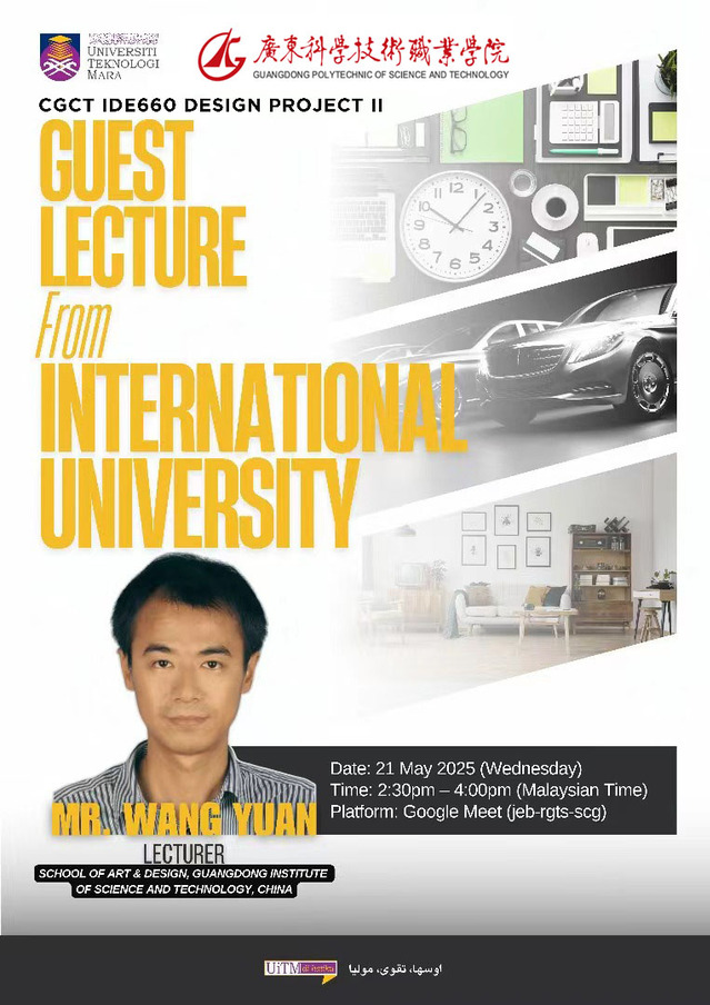 本站讯 5月21日,艺术设计学院产品艺术设计专业专任教师王远受马来西亚Uitm(马拉工艺)大学设计学院Azhari bin Md Hashim教授邀请,为Uitm设计学院专家、学者及学生共计40余人开展题为“未来智能汽车用户体验设计发展趋势”(Trend of Vehicles User Experience Design)的在线学术讲座。