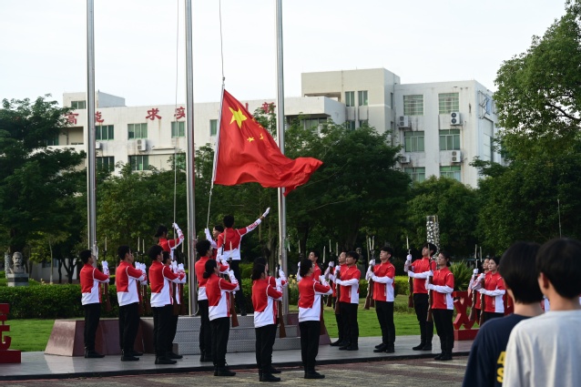 清晨,伴随着第一缕阳光,升旗仪式正式开始。国旗护卫队迈着整齐的步伐,护送着鲜艳的五星红旗走向旗杆。在雄壮的国歌声中,五星红旗冉冉升起,迎风飘扬。全体师生肃立,行注目礼,表达对祖国的崇高敬意。