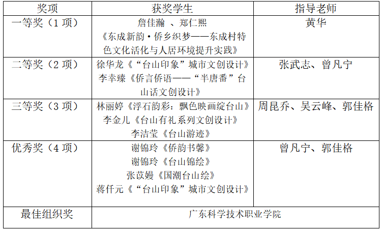本次大赛不仅是一场创意的比拼,更是广东科学技术职业学院与台山市积极落实“双百行动”赋能“百千万工程”、推动文旅产业高质量发展的一个生动写照和有力实践。这场文创盛会,正将侨乡基因转化为走向湾区的文化密码。愿每一份创意都化作连接湾区的文化纽带,让台山在传统与创新的碰撞中,持续绽放“山海侨韵”的时代华光,共绘农文旅融合的崭新篇章。
